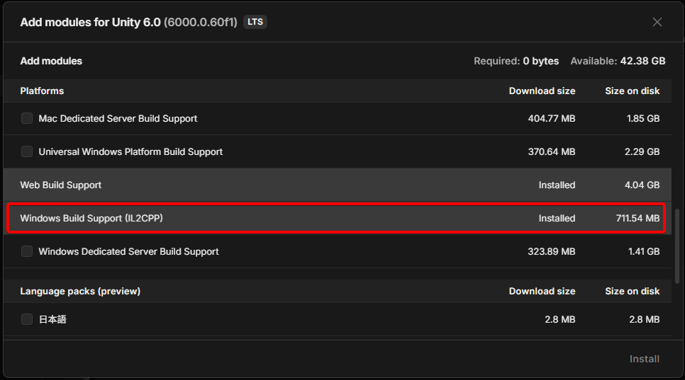 注意 記得要確認是否有安裝 IL2CPP Module!