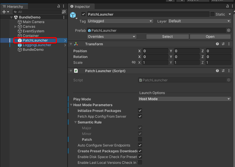 PatchLauncher is the runtime configuration and must be dragged into the scene as the sole runtime configuration.
