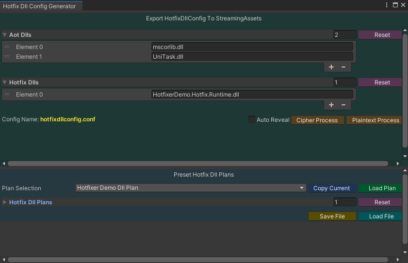 填写相关配置后,点击 Cipher Process / Plaintext Process 按钮即可生成配置文件 (自动输出至 StreamingAssets 底下)。